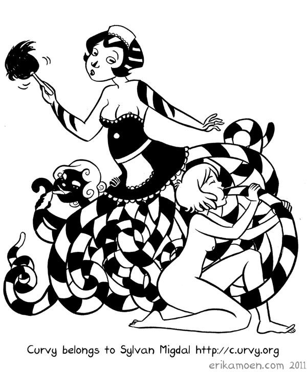 BIG NEWS! Chapter 4 of Curvy will start next week, but FIRST, I’m throwing an INTERNET PARTY! This week marks the tenth anniversary of my entry into webcomics, and to celebrate I’m having a guest week. So come back every day this week for awesome guest comics by cool, sexy people! If you missed the last page of chapter 3, flip back here.
